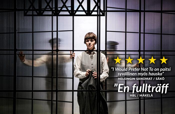 Hellen Willberg, Simon Häger och Patrick Henriksen är alla utomordentliga i sina roterande roller som berättaren och de två anställda skrivarna. Men Joanna Haartti som Bartleby är fullständigt fenomenal...Det är Haarttis fysiska spel som är så imponerande, från första minuten hon stiger in på scenen som den stela, klumpiga och obekväma Bartleby äger hon rummet, och med sitt subtila minspel antyder hon, snarare än visar sinnesstämningar och känslor, lämnar åskådaren fri att tolka och gissa vad som pågår i huvudet på denna besynnerliga människa...